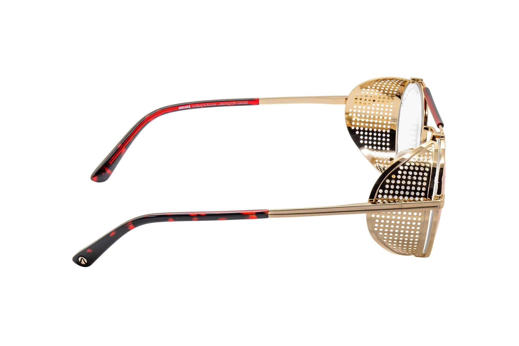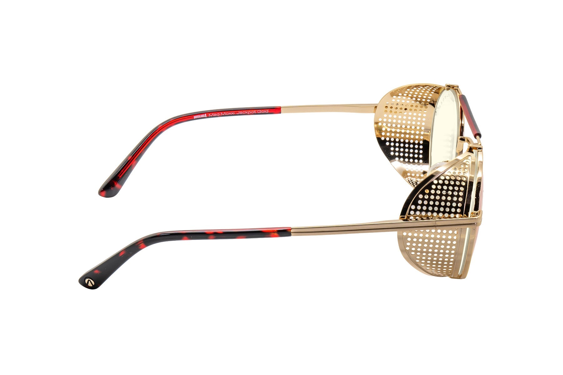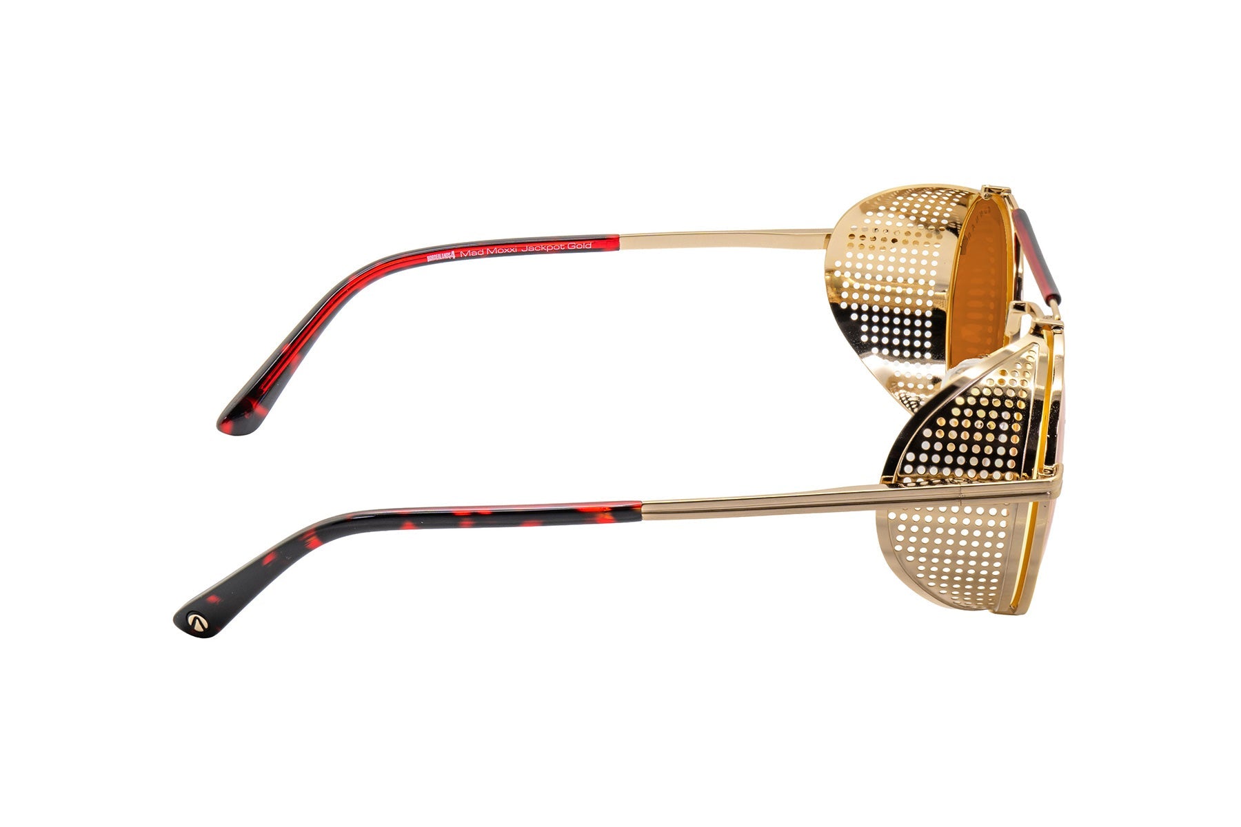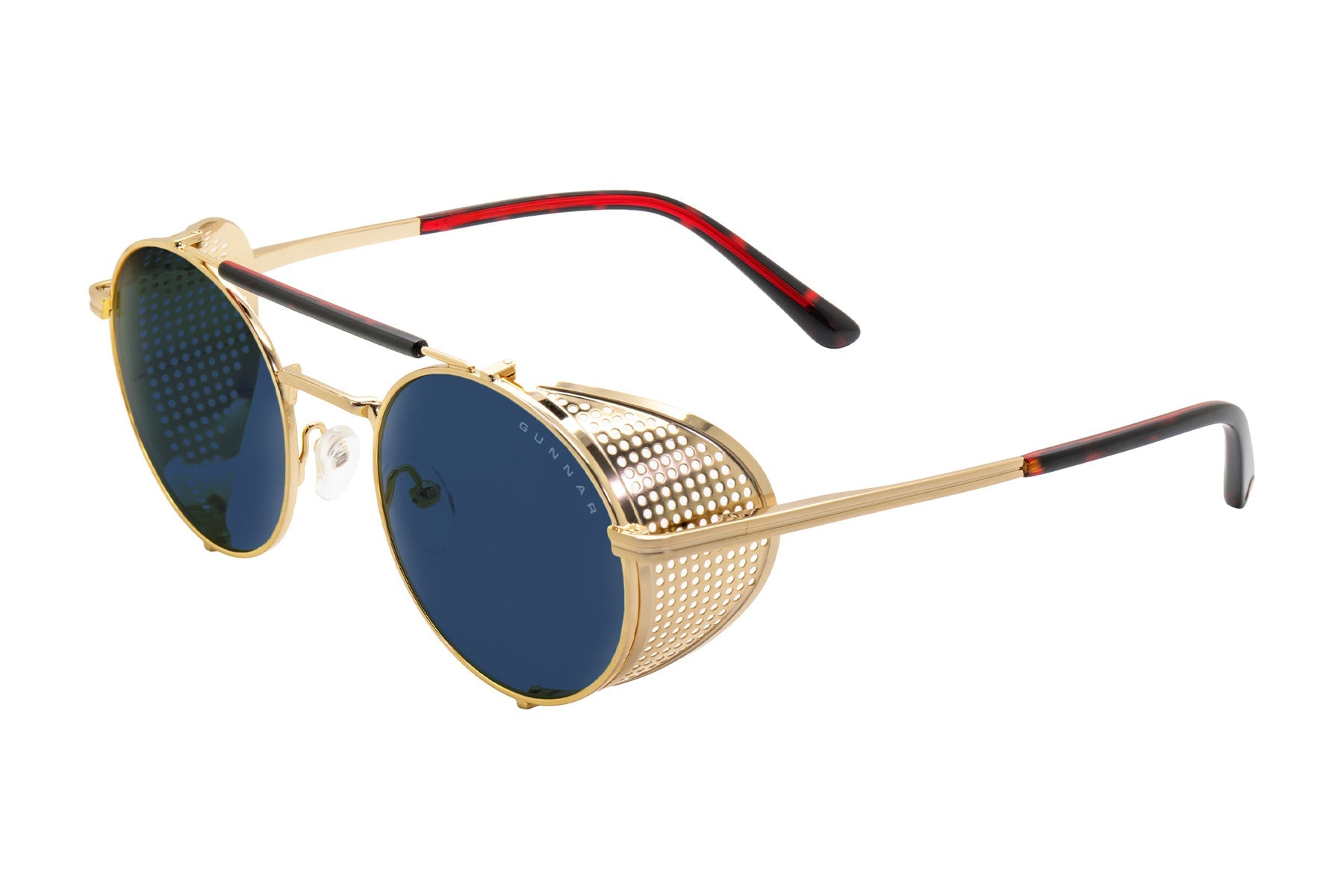 - Bold round stainless steel frame features a gold-tone finish with removable intricate mesh side shields
