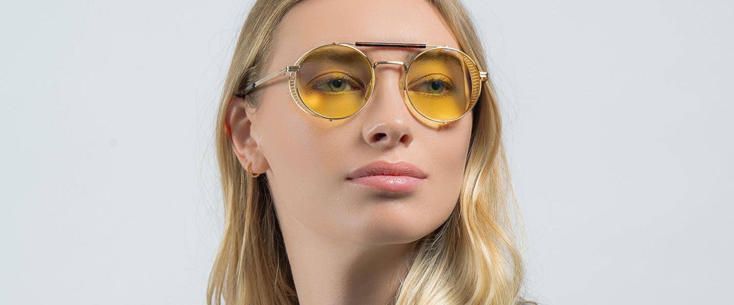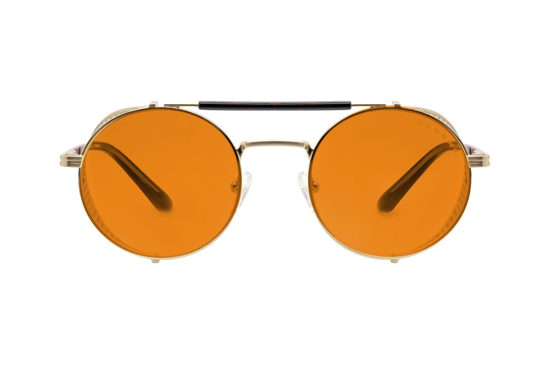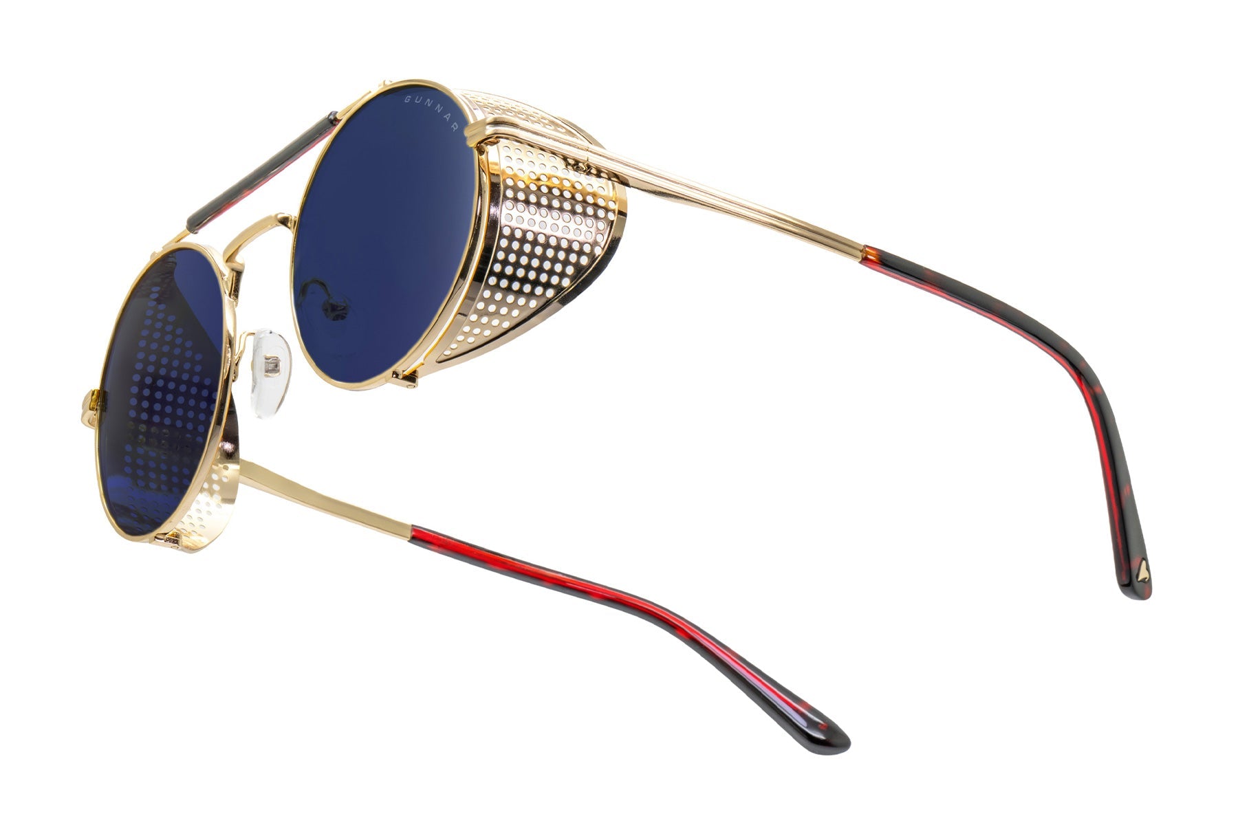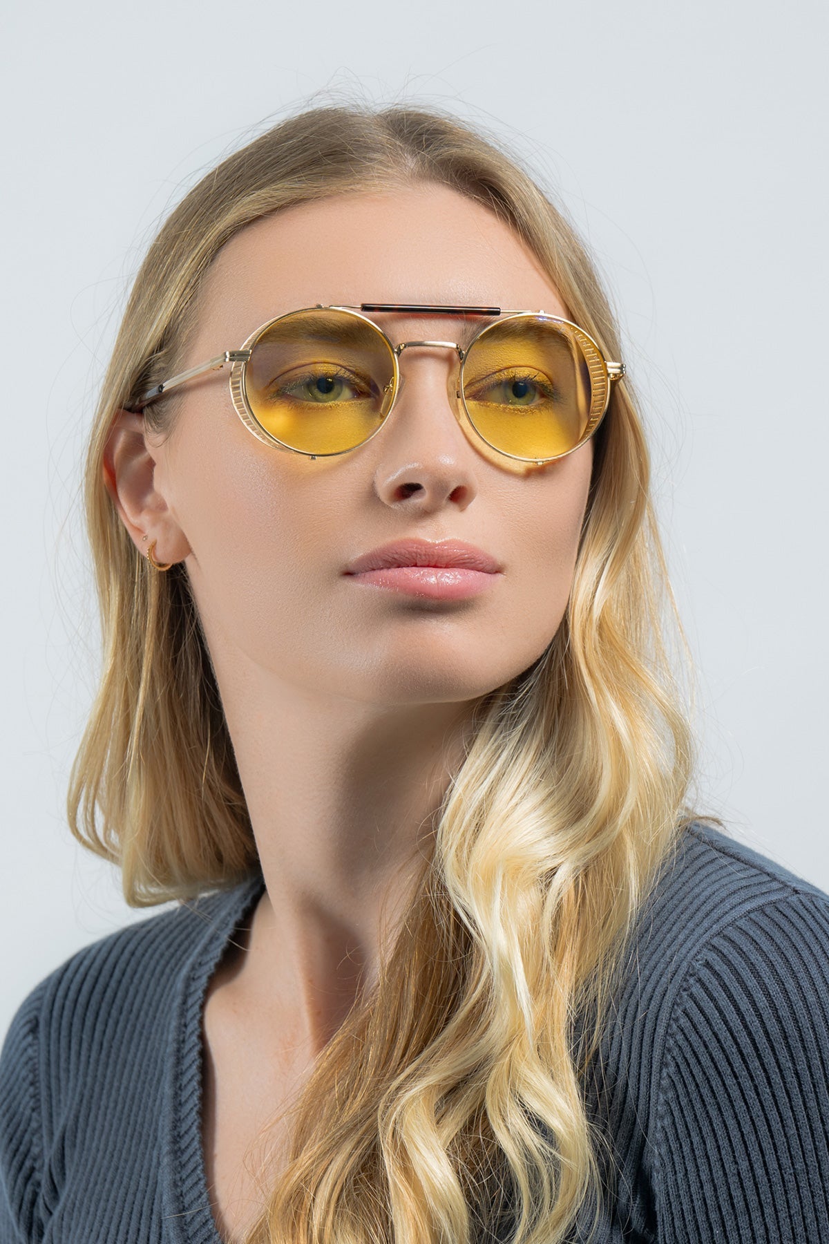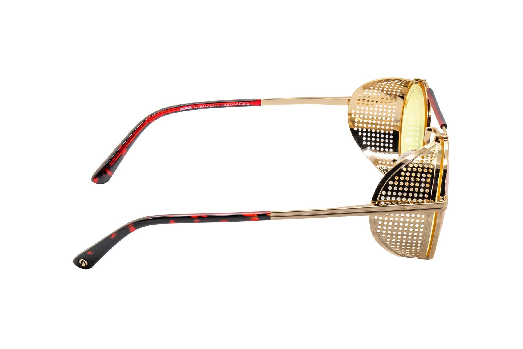 - Bold round stainless steel frame features a gold-tone finish with removable intricate mesh side shields
