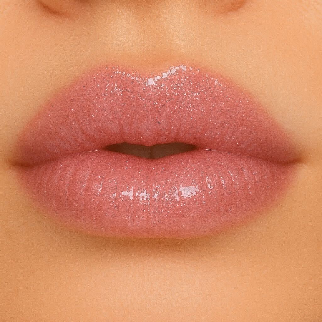 Our beautiful plum-mauve lip gloss is infused with gold & silver glitter.