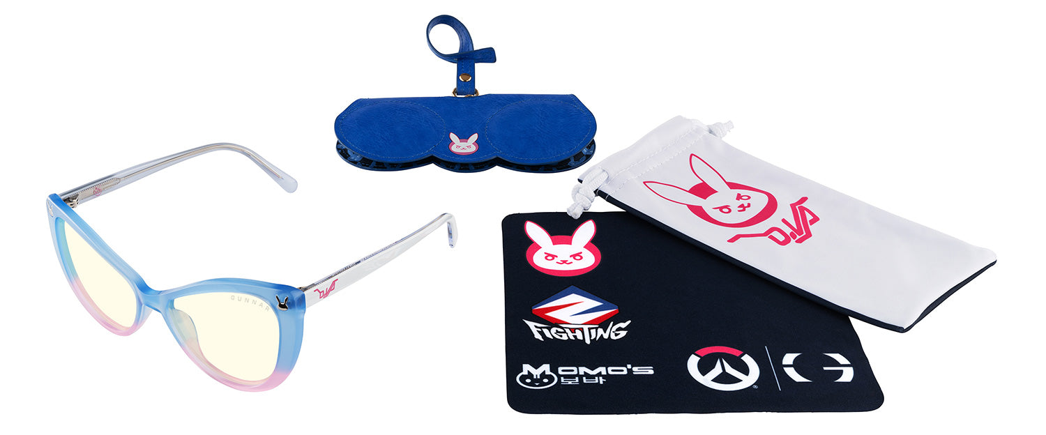 Time to save the world? Game on! The limited edition Overwatch® D.Va Tokki Edition represents the perfect fusion of GUNNAR technology and Blizzard Entertainment’s Overwatch pro gamer/hero D.Va. These legendary performance glasses feature her classic Tokki spark crystal colors in an acetate cat eye frame. Emblazoned with her corporate sponsors on the temples, the frame offers flexible spring hinges and advanced lens technology with exclusive collectors accessories including case, pouch and cleaning cloth. The glasses will be available in Amber 65 GBLF or Clear 35 GBLF tints.